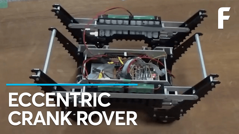 The Eccentric Crank Rover: a robot with a novel crank wheel mechanism and eccentric wheels to negotiate rough terrain. The robot climbs different obstacles and change direction in a quick way. As stated by the developers, the center of gravity is kept constant while the rover moves on a flat surface. Scroll down for video